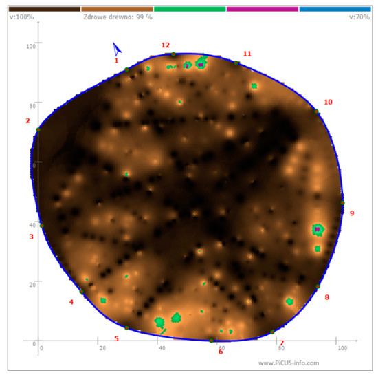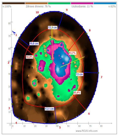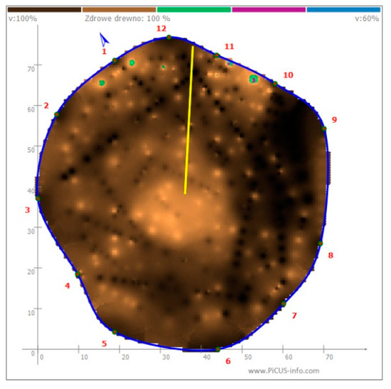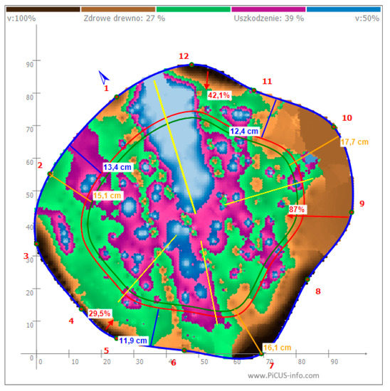 The diagnostics of the inside of tree trunks with the use of tomography, which uses sound waves for analysis, allows one to visualize the health condition of their internal structure in terms of detecting rotting, voids, or scrub without the need to perform invasive overhangs [23,24]. When analyzing the results obtained with the tomograph, special attention should be paid to the image’s color, which determines the wood density map. In the tomogram, which is the result of the study, individual colors indicate different speeds of sound propagation inside the trunk depending on the elasticity and density of the wood.