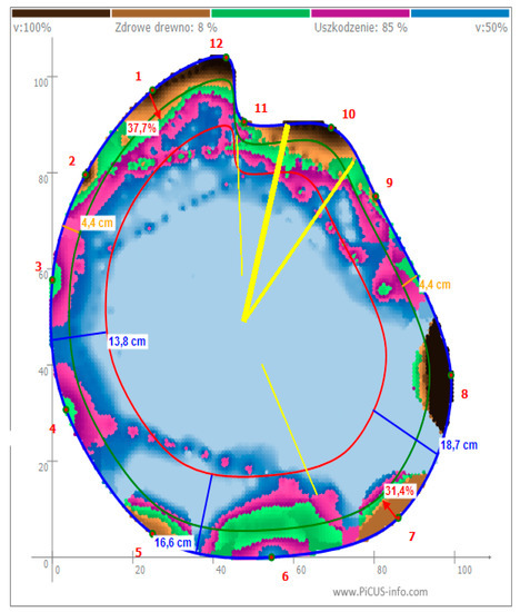 Then, a sonic measurement is made using a radio hammer. With its help, a sound pulse is generated at each subsequent measuring point, which is received by the sensors. During the generation of the wave, sensors record the time of receiving the signal. This stage is crucial, because then a visualization is created, showing the inside of the trunk (tomogram) with the exact size and location of the defect at a given height. The stage of acoustic diagnosis resembles the work of a woodpecker, hence the name. The image shown on a tomogram is usually relatively easy to interpret. The color shade from light brown to black corresponds to the speed of sound from 60% to 100%, which is equivalent to a living and healthy wood tissue. Different shades of green match the speed of the sound wave from 40% to 60%, which means a slight deterioration of the wood structure. Pink defines the sound range from 20% to 40%, and the color shade from white to blue corresponds to the sound range from 0 to 20%. The yellow lines on the cross-section of the trunk suggest the appearance of internal cracks, which are extremely dangerous because often, on the outside, there are no obvious visible symptoms that could confirm this [25,26]. The thicker the line, the greater the risk of this happening. On the other hand, the red line in the tomogram indicates the limit wall thickness, which allows one to determine the minimum mechanical strength of the tree trunk. Such data helps calculate the so-called t/R ratio, i.e., the ratio of healthy wood (t) to the radius of the tree trunk (R). According to the available literature, the t/R ratio should not be lower than 0.33, and in the case of trees with closed cavities, even 0.3 [27,28,29,30]. Any values below this limit increase the risk of the tree breaking at the least expected moment.