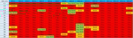 To analyze whether the SDG-LOs related to BAM are in fact covered by the LOs of BAM degrees, and according to the criteria explained in Section 2.1, a matrix was constructed in which the rows contain the SDG-LOs according to the categories Cognitive (C1–C5), Socioemotional (S1–S5) and Behavioral (B1–B5), and the columns contain the 17 SDGs. Figure 2 shows this matrix, where cells are named and colored according to following criteria: