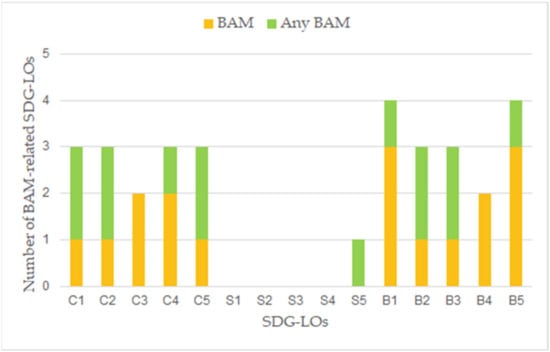 If the 32 BAM-related SDG-LOs are more closely analyzed taking into account their classification by UNESCO as cognitive (C), socioemotional (S) or behavioral (B), Figure 3 is obtained. Thus, Figure 3 shows, for each of the 32 BAM-related SDG-LOs (“BAM” and “Any BAM” categories from Figure 2), their classification as C, S or B according to UNESCO. From Figure 3, it can be observed that the majority of them are either behavioral (16/32 = 50%) or cognitive (15/32 = 46.9%), while only one (3.1%) is socioemotional. This implies that four socioemotional objectives (S1–S4) exist that are not specifically addressed in BAM disciplines, but rather in university courses other than BAM, in non-university studies or simply throughout life (belonging to the “Other” category).