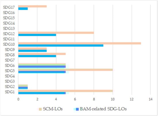Figure 4 shows, for example, that SDG10 is present in a greater number of SCM-LOs (13), of which nine correspond to BAM-related SDG-LOs. Next, SDG5 and SDG1, each with 10 SCM-LOs associated, 50% of which (5) being BAM-related SDG-LOs. In total, there are 58 SCM-LOs, of which 37 (63.8%) correspond to BAM-related SDG-LOs.