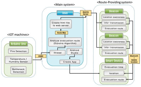 Figure 1 shows each step of the evacuation system prototype: (1) IoT (Internet of Things) devices for sensing; (2) main system to produce evacuation routes; and (3) the route-providing system. Table 1 shows the hardware and software used in the system. In the first step, an Arduino Uno R3 with a fire detection sensor, temperature/humidity sensor, and distance sensor monitors the indoor situation. Next, we attached a ZigBee module onto the Arduino Uno R3 to transmit sensor data to the main system. ZigBee is a wireless network standard with low power consumption and low latency [12]. Sensor data were captured every second, and the main system uses multi-threading to receive the data set from each Arduino device at the same time.