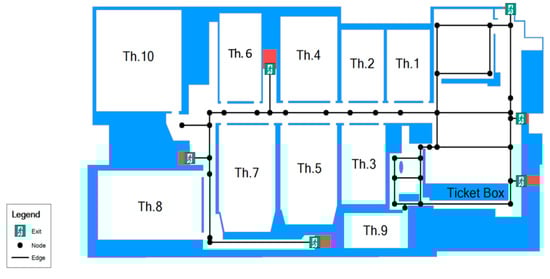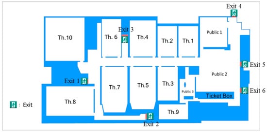The Entities are evacuees that are created individually as agents when the simulation starts and split into theaters according to the seating capacity of each. All agents have their shoulder width and speed parameters as state variables that are calibrated by multiple simulations. As for the scale, we built the virtual multiplex space that consists of 10 theaters (Th. 1 to 10) and has six main exits. The total seating capacity is 1846, excluding public spaces, as shown in Figure 5. Length and width are 110 m, 60 m separately.