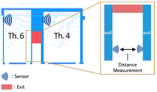 Figure 2 shows the nodes, edges, and exits in our simulation area and Figure 3 shows the method used to recognize bottlenecks in the main system. When fire emerges, the distance between each wall starts to be measured every second by two distance sensors. During an evacuation, this distance is shorter than normal since the space between the walls is crowded. Therefore, if the shorter distance is maintained, the main system starts to recognize it as a bottleneck. We defined this distance from each sensor as 50 cm and denoted the time parameter as a RToB (recognition response time of bottlenecks).