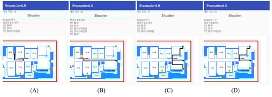 Next, we conducted several tests with different scenarios to verify the route-providing system. The first scenario considered whether the routes are changed in real time by the emergence of bottlenecks. The second scenario was to confirm whether one evacuee could receive changing detour routes when passing through the radius of each beacon. The results show that all functions worked without any computational issues as Figure 4 demonstrates. (B) and (D) each show changed detour routes from (A) and (C) separately when the bottleneck occurs.