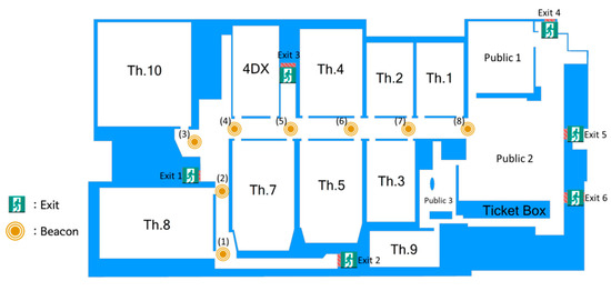 In the case of a fire, agents move to the closest exit. In the meantime, the beacons provide evacuees with alternative route maps when they pass through each beacon’s radius. Beacons were assumed to be installed in front of each exit, as shown in Figure 6. If the exit where the agents in the beacon radius are expected to reach was crowded, the detour routes provided were changed to avoid bottlenecks. To measure the evacuation effectiveness and optimize the system settings, we conducted multiple executions varying the beacon radius (2 to 5 m in 0.5 m increments) and RToB (3 to 13 s in 2 s increments). The total evacuation time and the number of people taking a detour were collected during each simulation. We set the maximum beacon radius to 5 m to avoid overlaps among beacons.
