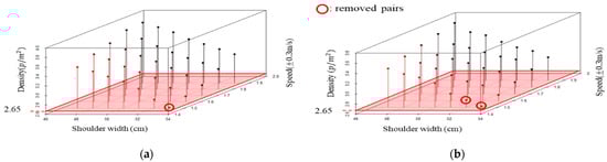 Figure 7 shows the density of evacuees in front of exit 1 and 3 by various shoulder widths (x-axis) and speeds (y-axis). According to the Liddle et al. (2009) [38], the density in front of an exit was 4.79 ± 1.00 people/m2 and 3.52 ± 0.87 people/m2 when the exit width was 1.6 m and 2.5 m, respectively. Since all exit widths were 2 m, we removed pairs that do not range from 2.65 to 5.79 people/m2. As a result, the pairs (1.2 to 1.8 m/s, 54 cm and 1.2 to 1.8 m/s, 53 cm) were removed.