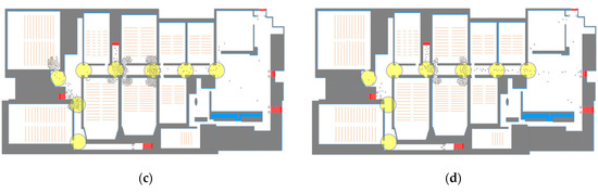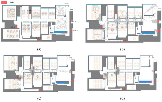 Simulation result with the evacuation system: (a) 20 s since the evacuation start; (b) 60 s; (c) 150 s; (d) 210 s.