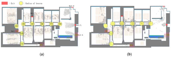 In Figure 9, all agents moved to the closest exit 20 s after the evacuation began. After 60 s, however, people who were located within the radius of the 6th beacon took a detour to avoid the bottleneck on exit 3. Similarly, people who were within the radius of the 2nd beacon changed their routes to exit 2, even though exit 1 is closer. People who passed through the 8th beacon chose the exits between 4, 5, or 6 evading bottlenecks throughout the simulation. The result showed that total evacuation time decreased by 70 to 100 s compared to the non-system situation.