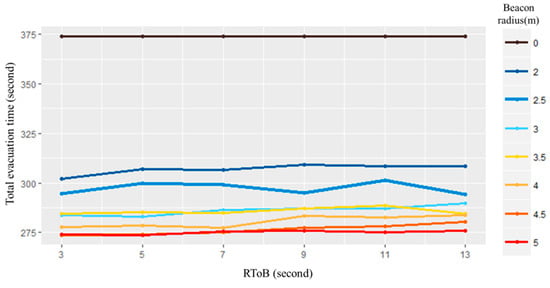 Figure 10 shows the total evacuation time result according to RToB and beacon radius parameters. Each point is an average of 15 simulation results. Zero m beacon radius refers to the simulation result when there was no evacuation system. As a result, the evacuation time decreased from 100 to 65 s when the system was introduced, which shows the beacon radius has a significant influence on the decrease of evacuation time. Otherwise, changing the RToB does not significantly affect total evacuation time.