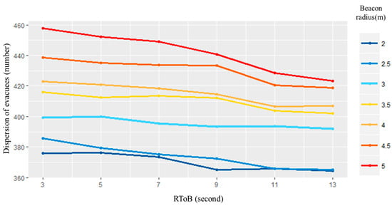 The dispersion of evacuees (population who follows alternative routes) is measured by each RToB and beacon radius range, shown in Figure 11. The result shows that the dispersion increases as the RToB decreases, and beacon radius increases. The maximum number of dispersed evacuees was 458, which accounts for 28.66% of the total evacuees when the RToB and beacon radius parameters were set to 3 s and 5 m, separately.