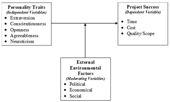 The significance of the big five personality traits (extraversion, conscientiousness, openness, agreeableness, neuroticism) with reference to project success in NGOs was studied by Hassan et al. and indicated that agreeableness, extraversion, and openness to experience were directly linked with project success [16]. Another study indicated that two of the personality traits, consciousness, and openness were positively correlated with project managers’ success [17]. On the other hand, external environmental factors also have a substantial influence on project success. Musa, et al. [18] measured the influence of external environmental factors (political, economic, and social) on project success and found that they had high influence. Moreover, these effects can be seen in different phases of the projects. Some of these factors significantly affect the projects during the planning phase but some factors like social and natural environmental factors continue affecting till the completion of the project. Another such factor that significantly impacts the project’s success is the political factor [19]. There is no significant evidence of the effects of project managers’ personality traits on project success while considering the impact of external environmental factors like social, economic, and political in the construction sector.