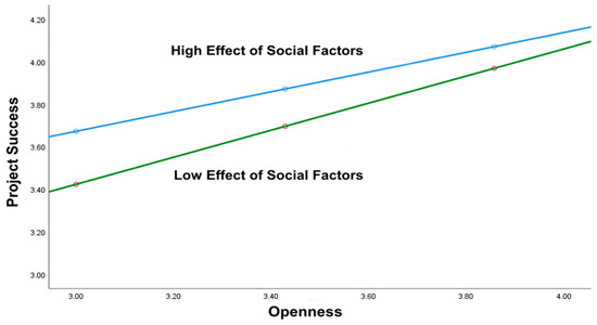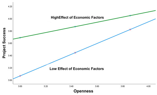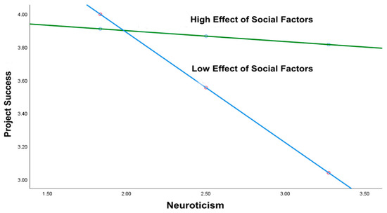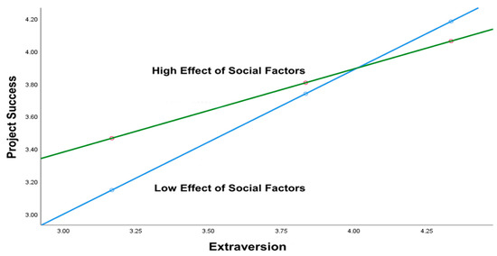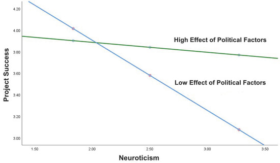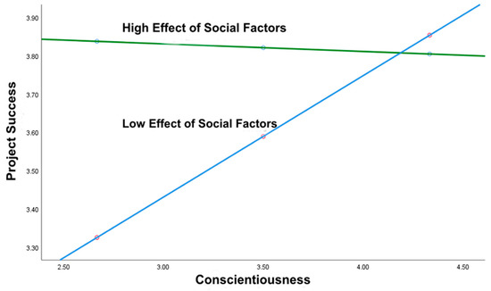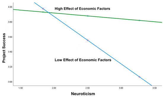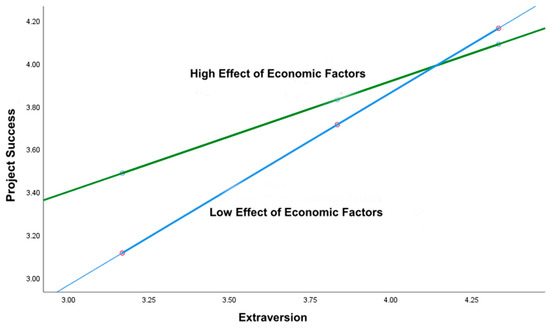 For specifying the nature of effects of external environmental factors as moderators, the interaction coefficient (b3) could be inspected [91]. The coefficients of b3 are shown in Table 5. The coefficient shows the number of units that slope of Y (i.e., project success) on X (i.e., personality traits) changes, given a one-unit change in Z (i.e., external environmental factors) [92]. For the clear presentation of results, regression lines have been plotted for the regression of Y and X for the value of Z as one standard deviation above and one standard deviation below the mean [92]. The illustrations are shown from Figure 2, Figure 3, Figure 4, Figure 5, Figure 6, Figure 7, Figure 8 and Figure 9 below for political, economic, and social environment respectively.