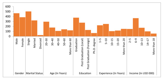 The data was collected through a modified and structured 5-point Likert scale and modified questionnaire. We have collected 856 responses from different pharmaceutical companies in China, India, Pakistan, Bangladesh, and Sri Lanka. Of 856 respondents, 456 (56.21%) were male, and 400 (44.12%) female; the rest of the demographic statistics are displayed in Table 1. We have used ‘K’ for thousands (000), and income was converted into the United States dollar for homogeneity purposes. Additionally, Figure 2 demonstrated the graphical explanation of the demographic statistics of respondents (Please see in Supplementary Materials).