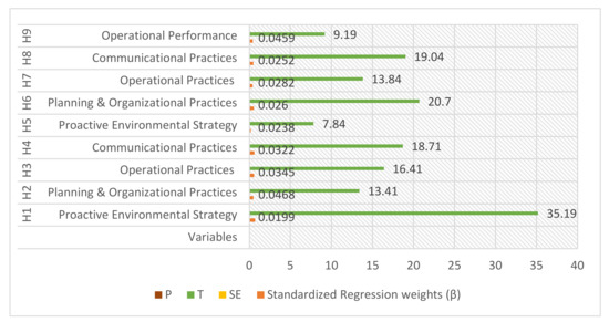 According to the organization, the competitive advantage increases the organizational profitability and financial performance; a proactive environmental strategy significantly reduces the environmental hazards, wastes, pollution, and energy consumption, and increases operational performance [12,33,58], which also have a positive impact on the financial performance of an organization. Other researchers have also found a positive relationship between proactive environmental strategy and financial performance [12,23,25,58]. Thus, we have framed the following hypotheses: