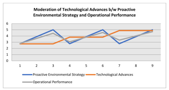 The explanation of technological advances is founded on the universal comprehension of scientific innovation outlined by the Oslo Manual [66] that differentiates processes and products or services innovations. According to Seid [16], Ioppolo et al. [67], and Ziegler and Nogareda [68], technological advances have a significant impact on services and products innovation, which is a specialized type of technological eco-innovation comprising of unique and highly upgraded services, processes, and products that reduce environmental hazards. The new technological advancement provides green capacities and specific resources with the help of scientific innovation. According to the natural resources-based approach, proactive environmental strategies offer the cumulative abilities and resources to secure environmental deprivation through environmentally friendly technologies, processes, and products [15,42,56]. Thus, technological advances help develop and experiment with novel openings at the corporate natural interface effectively and efficiently [55]. Technological advancement provides better eco-innovation strategies, which create the best-specialized strategies to prevent environmental hazards, reduce energy costs, and encourage sustainable development for an organization [2]. Several research studies have confirmed that technological advances indirectly impact the association of operational and financial performance, determinants of proactive environmental strategies [2]. According to Hsiao and Wang [36], Watson et al. [69], Liu et al. [70], Li et al. [71], and Salvadó et al. [72], technological advances have a vital role as a moderating variable in an association of operational and financial performance, determinants of proactive environmental strategies. Hence, we have framed the following hypotheses: