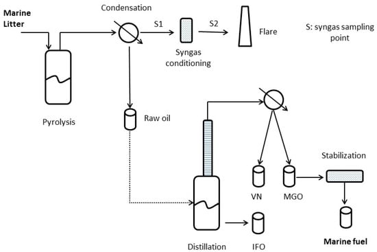 Starting from this point, new pragmatic and interdisciplinary ways to recycle mixed waste plastic along with value generation is the key to addressing long-term marine litter [18]. The chemical route to recycle mixed feedstock might be a good option instead [19,20,21]. At its broadest definition, chemical recycling basically aims to recover the constituent building blocks of the feedstock as useful products. Within this pragmatic concept, the recovered building blocks can become valuable feedstock for the chemical industry or can become flexible energy carriers suitable for straight application displacing conventional oil-based fuels. In addition, manufactured products can be directly used by the same stakeholders involved in the depollution activities, for example, the fishermen who already catch plastic waste along with fish during their day-by-day activity. This is considered a strong incentive towards an inclusive approach to the problem solving: the operators of the maritime economy can thus become positive actors and trigger a virtuous depollution cycle, as also suggested elsewhere [22]. Pyrolysis is a method that can potentially achieve the required degree of marine litter decomposition and the use of additives and catalysts can drive this process towards desired outcomes. Several papers have been published on the pyrolysis of plastic with the goal to produce fossil fuel substitutes [23,24,25]; however, most are mainly academic studies difficult to compare to each other or to scale-up because of the equipment used [26,27]. Thus, very few data are reported on actual large-scale industrial applications. Previous work shows that it is possible to manufacture fuels meeting international ISO standards from landfill plastic by means of pyrolysis at 10 ton/day, a relatively large scale [28]; even ultralow sulfur fuels can be produced by mean of conventional petroleum industry technologies from waste plastics for terrestrial transportation purposes [29]. Interestingly, based on our knowledge, no data are reported in literature about the pyrolysis of marine litter “as-is” for marine fuel synthesis; hence, our present research work is quite novel in this respect. Since huge amounts of fuel are used globally every year for marine transportation (207 Mt in 2017 alone, and over 36 Mt in 2019 in EU countries [30]), this makes a sustainable entry point for marine litter recycling products within a circular economy concept. In addition, often neglected is the environmental impact of the pyrolysis process itself, especially gaseous emissions into the atmosphere is the primary concern and contributes to the difficult public acceptance of such treatment plants. Thus, providing some results from a relative large-scale testing rig is of great significance to contribute to building confidence in the system and establishing the way for future investigation. Therefore, by performing trials on significant amounts of actual marine litter and by outlining coarse, but realistic figures of product yield, product quality and environmental impact, the fundamentals of marine litter recycling become finally available as an initial benchmark for further development. Within the activities of the EU funded project “Mapping and recycling of marine litter and ghost nets on the sea floor” [31], portable pyrolysis and distillation equipment were designed and operated. Since this project’s focus was on marine litter and engagement of stakeholders involved in the maritime economy, the target products were marine fuels, which would be readily available for use in fishing boats.