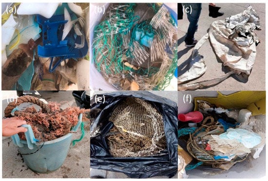 Actual marine litter used in pyrolysis tests: (a) mixed containers, (b) mussel nets, (c) ecoleather, (d) mooring lines, (e) trawl fishing nets, and (f) mixed floating litter.