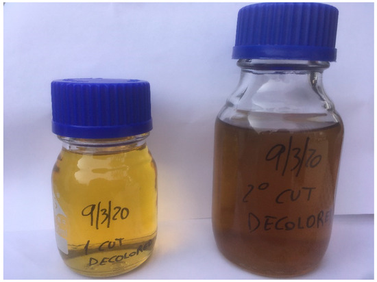 Coming to the products of distillation, MGO is the dominant outcome, but also high amount of VN has to be considered as a valuable product. Interestingly, only about 6% (V/V) of IFO was obtained, therefore this approach leads to the production of fuels (and potentially also chemicals for the VN) with the highest economic value among the marine fuel family members. Since distillation was performed at atmospheric pressure, cracking reactions occurred leading to product loss in form of gas and coke. This suggests that vacuum distillation could be more appropriate for pyrolysis oil production to reduce cracking reactions and related product loss. Presence of water, originally not recognizable in the pyrolysis oil, probably because in form of emulsion was this time recovered together with the VN and easily separated. Presence of water was not problematic for distillation, but since water is not miscible with hydrocarbons, a sort of “steam current distillation” was actually occurring, at least in the beginning phase. Since boiling temperatures change in presence of water, this aspect is also of some importance if low carbon number products are desired to be separated selectively and not as bulk as done in this case. Figure 3 shows the visual appearance of the products.
