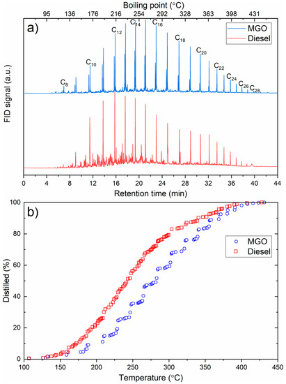 GC-FID results for MGO and commercially available diesel fuel: (a) chromatograms with estimated boiling point of eluted compounds (R2 = 0.997 correlation between retention time and boiling point), (b) GC-FID-based simulated distillation profiles.