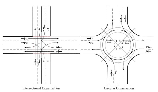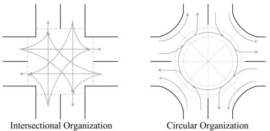 The advanced development of automation and wireless communication technologies enables the new generation vehicles: Connected and Automated Vehicles (CAVs). CAVs are poised to reshape transportation and mobility by replacing humans as the driver and service provider, this transformation provides a valuable opportunity to improve safety, capacity, energy efficiency and reduce emissions [1], to mitigate challenges of transport and logistic services [2], thereby contributing to sustainable development. How to prepare for the opportunities and challenges brought by CAVs has become a popular research topic [3,4], including the new challenges of the corresponding traffic flow management under CAVs environment. As the crux of traffic network, the intersection management for CAVs has been researched [5]. With the ability to communicate with each other and between infrastructures, CAVs can negotiate the right-of-way at intersections and coordinate their movements without the indications of signals. Based on these characteristics, Autonomous Intersection Management (AIM) is customized for CAVs. In AIM [6], the intersection area is divided into cells, CAVs need to send requirement to reserve the spatial-temporal occupancy of cells from the Intersection Manager (IM). With collision-free as the primary principle, the reservations would be accepted or rejected in accordance with right-of-way assignment policies. There are variant signal-free intersection management policies for CAVs have been proposed and studied. However, the vast majority of them are based on the setting that the vehicle trajectories are intersection-organized, while research based on circular organization, i.e., roundabout, is far less. The two organizations at a road junction are depicted in Figure 1.