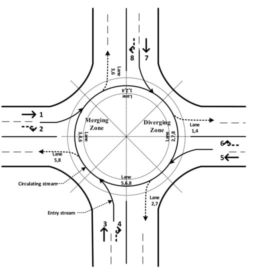- Kimber, R. The Traffic Capacity of Roundabouts, TRRL Laboratory Report 942; Transport and Road Research Laboratory: Crowthorne, UK, 1980. [Google Scholar]