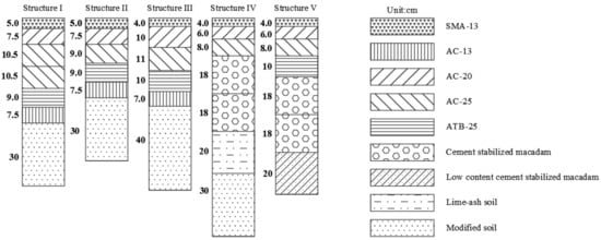 In order to analyze the influence of a pavement’s structure on its anti-reflective cracking performance and to compare and analyze the difference of anti-reflective cracking performance between a full-depth asphalt pavement and a general semi-rigid base asphalt pavement, five different pavement structure types are selected, as shown in Figure 1. Structures I, II and III refer to a full-depth asphalt pavement, and structures IV and V refer to a general semi-rigid base asphalt pavement. The thickness and material of each layer of the five pavement structures are shown in Figure 1, and the material parameters are shown in Table 1.