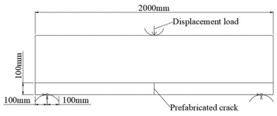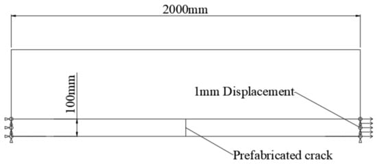 Loading mode II: Analytical model based on the direct tension mode. The lower side of the model is a free boundary, and the boundary conditions are set on the left and right sides of the bottom cement stabilized macadam layer. The left side is completely fixed, the right side is fixed with vertical displacement and the transverse tensile displacement is 1 mm. Prefabricated cracks are set in the middle of the cement stabilized macadam layer 10 cm below the model. Loading mode II is shown in Figure 3.