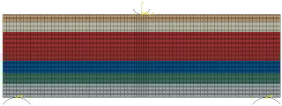 The extended finite element method (XFEM) is used to establish the finite element model. The CPS4R element—namely, the four-node bilinear plane stress quadrilateral element—is used as the mesh. The vertical side length of the mesh is 10 mm, and the finite element model is shown in Figure 4. It is assumed that the pavement material is homogeneous and isotropic, and the layers are completely continuous.