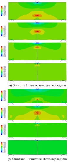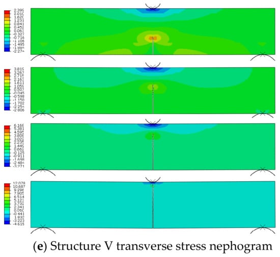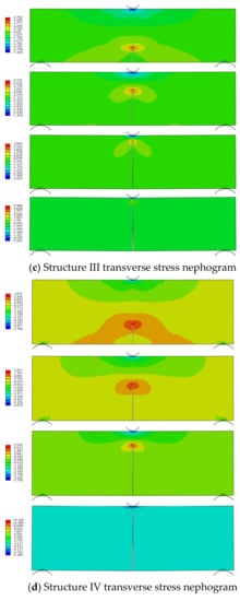 At present, there is no relevant research on the numerical simulation of the anti-reflective cracking performance of a full-depth asphalt pavement. By comparing the research results of this paper with similar references [44], the crack propagation path is the same, which preliminarily proves the correctness of this research method. Based on loading mode I, the propagation process of reflection cracks in five pavement structures is obtained. When the loading displacement of the indenter on the model is 1.5 mm, 3 mm, 4.5 mm and 6 mm, respectively, the transverse stress nephogram of the five pavement structures is shown in Figure 5. It can be seen from Figure 5 that the cracking process of different pavement structures is basically the same. During the whole cracking process, the stress is concentrated at the crack tip and the upper part of the structure, and the absolute value of the stress at the contact point of the indenter is larger, while the stress at the lower support is smaller, and thus closer to the other parts of the structure. At the initial stage of loading, the stress at the indenter diffuses to all sides, and the stress at the crack tip diffuses to the left and right oblique downward. When the displacement load is half loaded, the stress at the bottom of the crack tip decreases and the crack propagation speed increases. When the displacement load increases from 3 mm to 4.5 mm, the crack expands rapidly, and the stress concentration range at the crack tip shrinks and becomes oblate. Because the crack tip is close to the upper load application position, the stress diffusion area at the indenter to the left and right sides increases, and the diffusion range to the lower side decreases. Finally, when the displacement load is fully applied, the crack expands to the loading point, the stress area at the crack tip is in the shape of an inverted heart and the stress is concentrated at the crack tip and the indenter. The stress in other parts of the structure is small and evenly distributed.