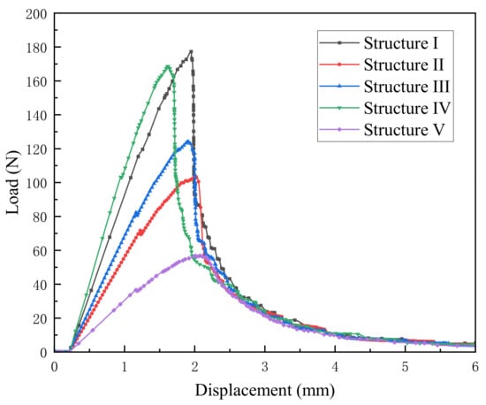 According to the variation law of the load-displacement curve, the fracture process of the structure can be divided into three stages. The first stage is the complete elastic stage, in which the load increases linearly with the increase of displacement and the growth rate of the five structures is different. At this stage, the curve is similar to the elastic deformation stage, when the crack growth rate is slow. The curves of the five structures reach the peak value when the displacement reaches about 2 mm, and then the load decreases rapidly with the increase of displacement, entering the stage of crack initiation and the propagation stage. At this stage, there are some differences in the curves of the five structures: the load of the other four structures, except for structure V, is reduced by nearly half, while the load of structure V is decreased gently. At this time, the crack propagation rate is faster and the structure cracks rapidly. Finally, with the increase of displacement, the structure enters the complete fracture stage, in which the load is small and the curves of the five structures roughly coincide. The whole structure is nearly destroyed, but not completely cracked.