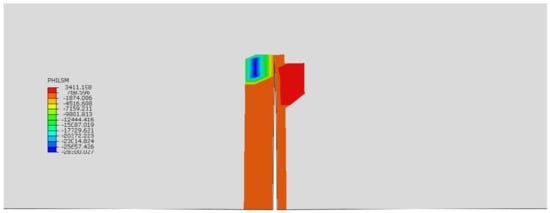 In the simulation analysis of loading mode II, the output parameter PHILSM is the specified displacement function describing the crack surface, namely the hierarchical set value, which can be understood as displaying the contour surface of the crack. When the crack passes through an element, the value of PHILSM will appear on all four nodes of the element. The PHILSM value of the node on the same side of the crack is the same. The position where the value of PHILSM between nodes is 0 is the point where the crack passes through the element. Therefore, the length of the crack can be determined by the position of the crack (excluding the length of the prefabricated crack) in the output PHILSM nephogram, and the width of the crack can be determined by the lateral displacement of the left and right elements at the specified position. Figure 7 shows the nephogram of PHILSM at the cracking location of structure I, which has been enlarged. As shown in Figure 7, the gray part is the area without the PHILSM value, while the colored part has the PHILSM value, that is, the cracking position. As can be seen from the caption, the part where the value is 0 is orange, so the location of the crack can be more intuitively determined, and the crack’s length and width can be obtained.