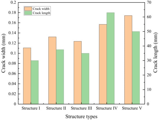 Crack length and width of five pavement structures.