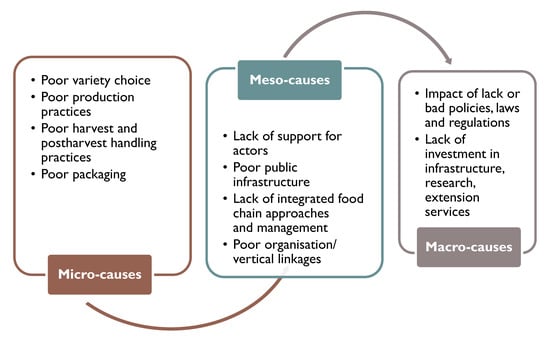 26], causes of food loss and waste (FLW) in the food supply chain can be categorised at three levels depending on the actors and institutions involved. Micro-level causes refer to causes at each stage of the food chain where FLW occurs that result from actions (or non-actions) of individual actors at the specific stages. Meso-level causes refer to secondary causes or structural causes that may be at the same or at another stage of the chain than where FLW happens. These can be attributed to how different actors are organised together, relationships along the food chain, the state of infrastructure, food standards, food labels among other organisational matters. Meso-level causes can contribute to the micro-level causes and/or determine their extent. Macro-level causes refer more to systemic issues such as malfunctioning food systems, the lack of institutional or policy conditions to support actors in the supply chain. The causes of FLW are inter-related and should not be addressed in isolation.