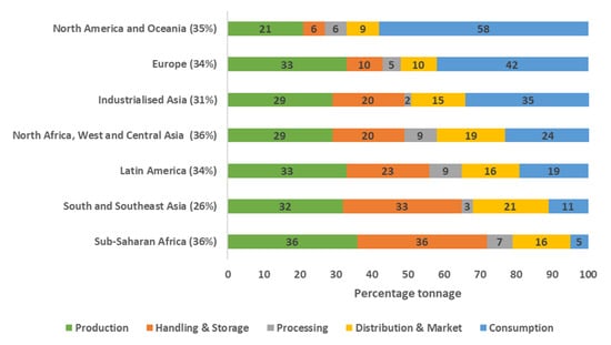 Figure 5, it is noteworthy that although the reported FLW across the regions is in the same range (26–36%), the distribution of the losses along the supply chain varies significantly across the regions. Specifically, in the more developed countries there is more wastage at the consumption and food service stage. Food wastage at this stage is attributed mostly to poor planning by consumers, leading to excess purchases of perishable produce that end up being discarded.