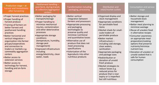 Figure 6 reports on some of the possible interventions to reduce quantitative and qualitative losses at various stages of the supply chain