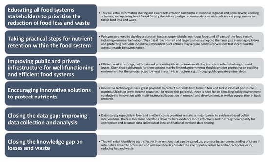 From the foregoing, it is imperative that the interventions to reduce loss and waste in nutritious foods must be specific and targeted to the context, sector and value chain stage. Such interventions could target individual actors in the supply chain (micro-level solutions) and could address the systemic issues that contribute to the losses and waste (macro-level solutions).