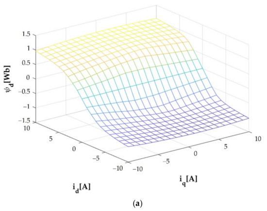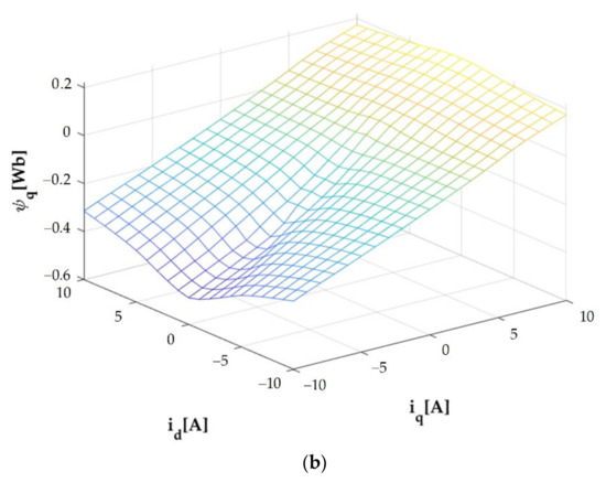 Figure 2. The flux linkages Ψd and Ψq in the function of id and iq. (a) Ψd(id,iq). (b) Ψq(id,iq).