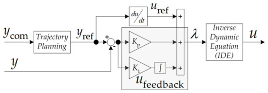 The control law’s block diagram is provided in Figure 3. The trajectory planning, the feedback control (relying on two controller gains Ki and Kp), the controller output λ, and the inverse dynamic equations are detailed below.