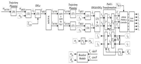 Note that the stability and response of the differential flatness-based control are easy to set compared to the traditional PI controller. By defining and selecting the governing damping and natural frequency [21,22], as shown in Figure 6, the controller parameters of current and speed loop control may be calculated by Equations (29), (30), (35) and (36).