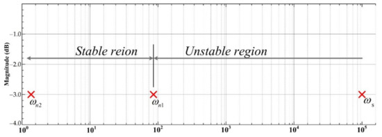 Based on the current and speed control law development, the natural frequency setting of the designed controller is depicted in Figure 6. The switching frequency fs of the inverter shown in Figure 4 is equal to 16 kHz (ωs = 105 rad.s−1) and it is reported in Figure 6. According to Figure 5, the speed control loop must be faster than the current control loop given that the outer speed loop enables assessing the torque reference value, and consequently the current. Considering the Nyquist-Shannon Theorem, the natural frequency ωn1 must be chosen lower than a frequency equal to 102 rad.s−1 (namely two times lower than the switching frequency ωs). Therefore, the natural frequency ωn1 for the current control loop has been tuned at 2000 rad.s−1; while for the speed control loop, a natural frequency ωn2 has been set at 20 rad.s−1 (100 times lower than ωn1). Both values have been reported in Figure 6, allowing defining the stable region included between these two values; whereas the unstable region is outside the natural frequency ωn1. Regarding the tuning of the damping ratios ζ1 and ζ2, to guarantee underdamped transient behaviors with low overshoot and fast response, both parameters have been set at 0.7.