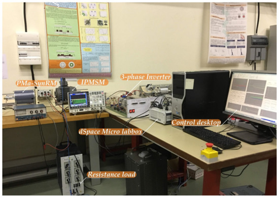 A small-scale test bench 1-KW relying on the PMa-SynRM has been conceived in the laboratory, as shown in Figure 7. Table 2 sums up the principal parameters of the studied machine. Table 3 outlines the controller parameters. The motor is supplied by a 3-kW 3-phase inverter (DC/AC) operating at a switching frequency of 16 kHz. Besides, the input DC grid voltage of the inverter is fed by a 3-phase variable power supply combined with a 3-phase diode rectifier. The PMa-SynRM is mechanically coupled with an IPMSM (interior permanent magnet synchronous motor) feeding a resistive load (see Figure 4 and Figure 7). Regarding the measurements both for the speed and rotor angle, they have been acquired by a resolver placed on the rotor shaft. The developed control scheme (see Figure 5) relying on the differential flatness controller has been modeled in the Matlab/Simulink software, and then it has been incorporated in the dSPACE 1202 MicroLabBox real-time interface to generate the gate control signals applied to the VSI.