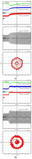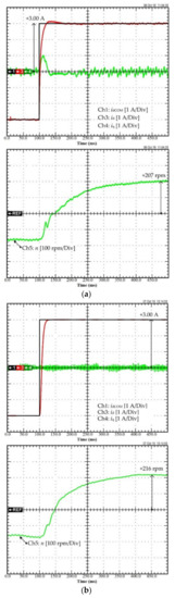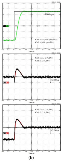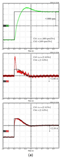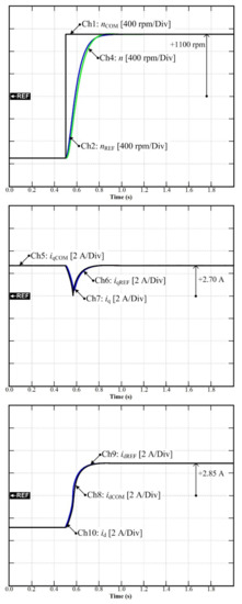 For the second scenario, the performance of the system when the torque/current loop employs traditional PI control and differential flatness is compared to assess the benefits of the elaborated control scheme. Figure 10a represents the experimental results of the conventional PI control, and Figure 10b illustrates the experimental results of differential flatness control. In Figure 10a, Ch1 is the current idCOM, Ch3 is the measured current id, Ch4 is the measured current iq, and Ch5 is the measured speed n. In Figure 10b, Ch1 is the current idCOM, Ch3 is the measured current id, Ch4 is the measured current iq, and Ch5 is the measured speed n. As shown in Figure 10a,b, in a transitory operation, the id of PI control exhibits a small overshoot, compared to the differential flatness controller, and the iq of the PI control shows oscillations.