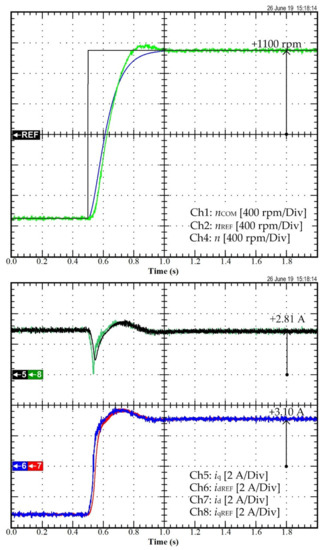 For the first scenario, Figure 8 reports the obtained simulation results; whereas, Figure 9 exhibits the performed experimental tests to assess the dynamic performance of the designed controller when forcing the motor to reverse direction. In Figure 8, Ch1–10 are the command signal of the speed nCOM, the reference signal of the speed nREF, the measured speed n, the command of q-axis current iqCOM, the reference of q-axis current iqREF, the q-axis current iq, the command of d-axis current idCOM, the reference of d-axis current idREF, and the d-axis current id, respectively. In comparison, in Figure 9, Ch1–8 are the speed command nCOM, the speed reference nREF, the measured speed n, the current iq, the current reference idREF, the current id, and the current reference iqREF, respectively. Firstly, the PMa-SynRM model has been tested by using Matlab/Simulink to support that the elaborated control system is appropriately conceived. Simulations and experimental tests have demonstrated that both simulation and experimental results are similar. Thus, the PMa-SynRM model is fit, and the controller parameters are suitably designed by choosing desired parameters. The experimental results indicate that the PMa-SynRM behaves in a good way when operating under the regenerative mode up to the speed the reference gets positive. Furthermore, it can be emphasized that the measured speed through the resolver enables tracking adequately the speed reference value. Afterward, the operation of the PMa-SynRM is shifted to the motoring mode up to the rotor speed comes to the speed command. The d-and q-axes currents reveal an appropriate behavior without surpassing the imposed limits. The dominant parameters of the PMa-SynRM enable being ensured, and the elaborated control offers worthwhile dynamic performance.