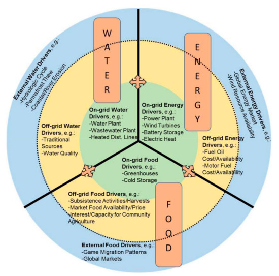 Previous studies have been conducted with diverse scopes and frameworks [2,3,4]. The scope of prior research is often either on a large-scale, a regional or a national scale [5], or a very detailed scale, such as at the household level [6,7]. Several studies propose models to evaluate FEW connections including resource management strategies [8], water and energy resource planning tools [9], or the quantification of environmental impacts [8]. However, there is little research on community-scale FEW systems and on the influence of RE on such systems, especially in the Arctic. This analysis aims to fill that gap by using, in part, existing concepts and applying them differently due to the small size of the observed communities.