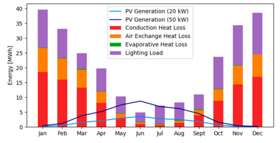 The energy demand of the greenhouse consists of the heating and cooling demand, as well as the artificial lighting required for the crops. The subdivision of the modeled demand is shown in the stacked bars in Figure 2, where the light and dark blue lines represent the monthly generation of a 20-kW and a 50-kW ground-mounted solar PV installation, respectively, highlighting the seasonal mismatch between solar PV generation and the greenhouse energy demand. Since heating represents a large amount of the energy demand throughout the year, the sensitivity of the construction material was observed by changing from double-pane to triple-pane windows. This change was able to reduce the yearly heating demand by 20.2%. There is a strong mismatch between demand and generation due to an assumed year-round operation of the greenhouse; other operational schedules, such as no winter growing, were considered in Section 3.3.2.