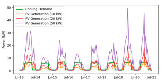 With a 5-kW solar PV unit, approximately 42% of the total load (16,300 kWh is the total cooling demand) can be covered, due to an advantageous seasonal overlap of cooling demand and solar PV generation. This can be observed in Figure 3, which shows the hourly load and solar PV generation for several days in the month of July.