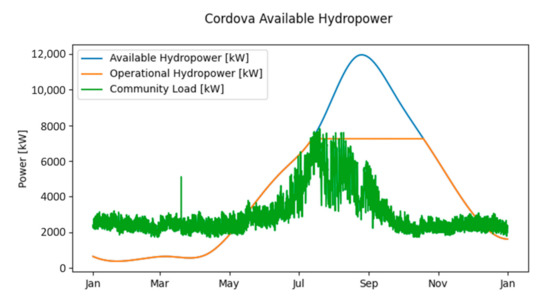 The community currently has approximately 7.25 MW of installed hydroelectric capacity, which, according to the ideal model, covers approximately 79% of the community’s yearly load. The electric power demand of the fish-processing plant, which leads to the observed increase in community electric power demand during the summer, can be covered almost exclusively by the hydroelectric power plant. The results were reached by using historical creek flow rates [43,44] applied to Equations (3) and (4) in combination with the community’s load data [45].