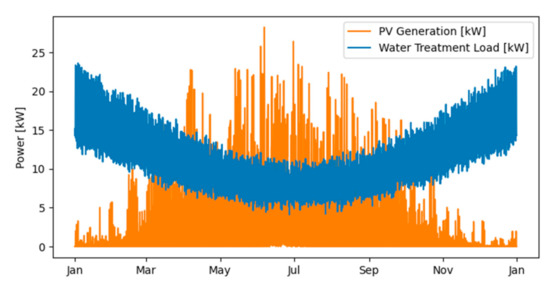 The water treatment plant demand is at its lowest during summer [46] when solar energy peaks. However, the seasonal variability of the load is not as strong as that of the greenhouse in Section 3.1.1. For the water treatment plant, 19% of the load occurs during the summer months and, overall, the load is spread more evenly throughout the year. This allows solar power to cover a more substantial amount of the load.