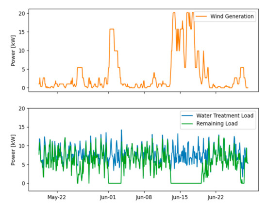 The water treatment plant load in a community in southwestern Alaska is similar to the one in the Interior in Section 3.2.1. The demand includes lighting, refrigeration, washers and dryers, as well as space heating and ventilation [32]. Figure 6 shows the wind generation of a 15-kW turbine (top, orange), the total load (bottom, blue), and the remaining load (bottom, green). The remaining load must be met by diesel-electric generators. Wind power does not have the distinct daily and seasonal pattern of solar PV generation. The depicted time frame of one month is representative of the wind power dynamic throughout the entire year, as is also presented in Figure A6, which shows the daily profile of the water treatment plant and wind turbine generator for select days throughout the year. As can be observed in Figure 6, wind power can cover the load of the water treatment plant for several days in a row, followed by multiple days with low generation and consequently, low coverage.
